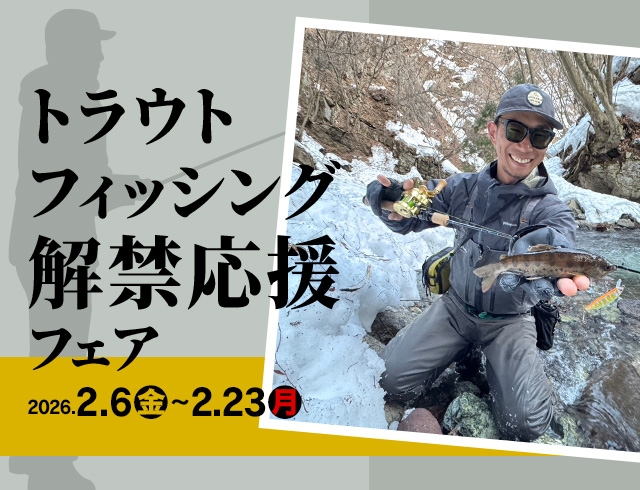 トラウトフィッシング解禁応援フェア トラウトフィッシング解禁応援フェア 開催! いよいよ解禁! 新しいシーズンを新しいギアで楽しみませんか? 『トラウトフィッシング解禁応援フェア』 開催期間 2026年2月6日(金)~2月23日(月・祝) 開催店舗 WILD-1全店(公式オンラインストアを含む) 期間中、当社指定のウェーダー、ウェーディングシューズが 表示価格からレジにて10%OFF! ※画像はイメージです Tweet