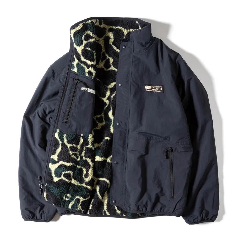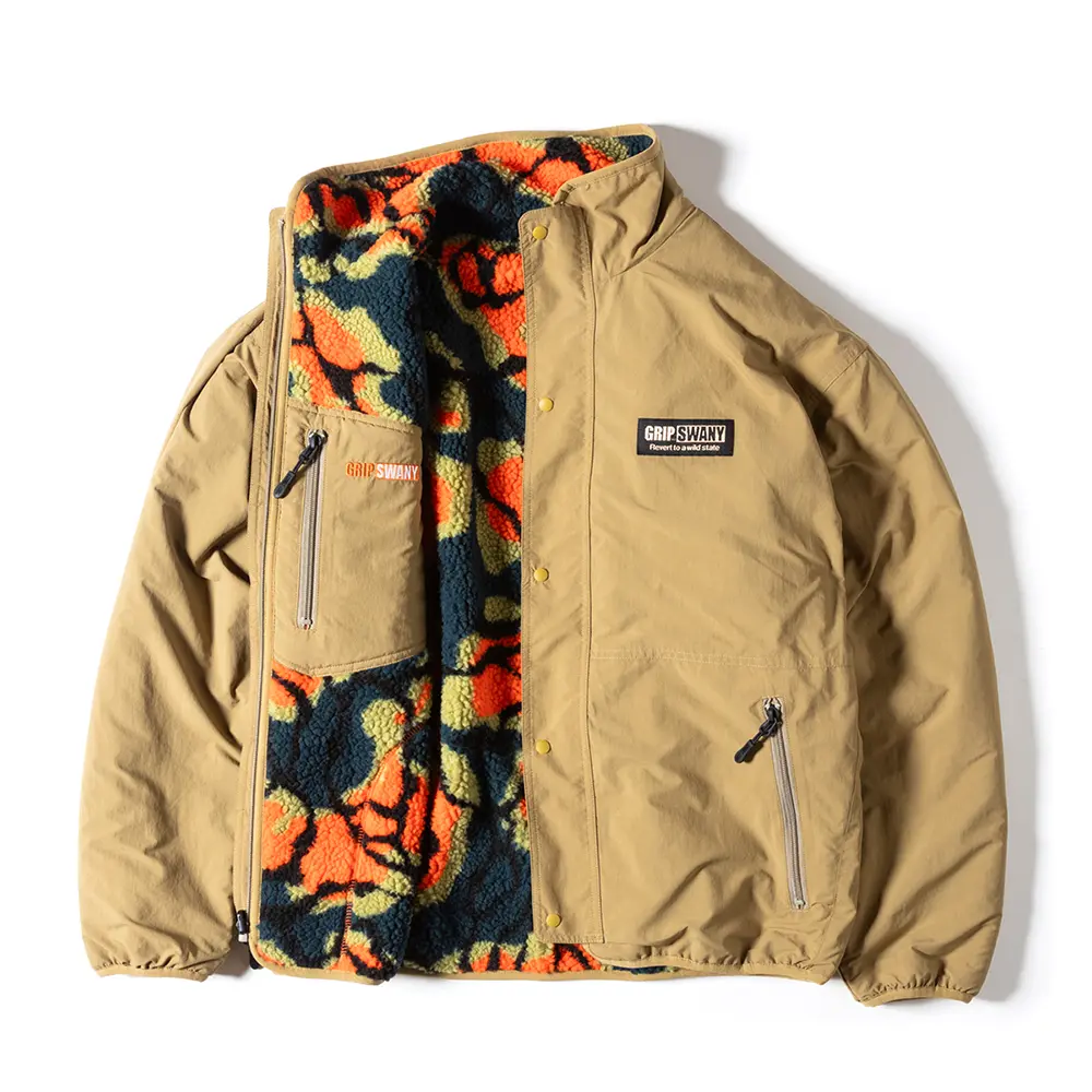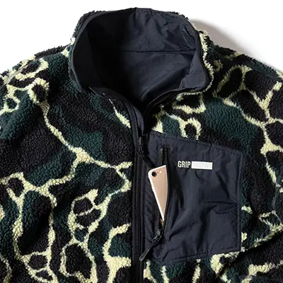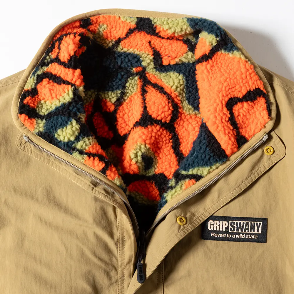 撥水ナイロンシェルにオリジナルジャングルカモフラージュ柄のボアフリースを採用した、両面着られるリバーシブルジャケット