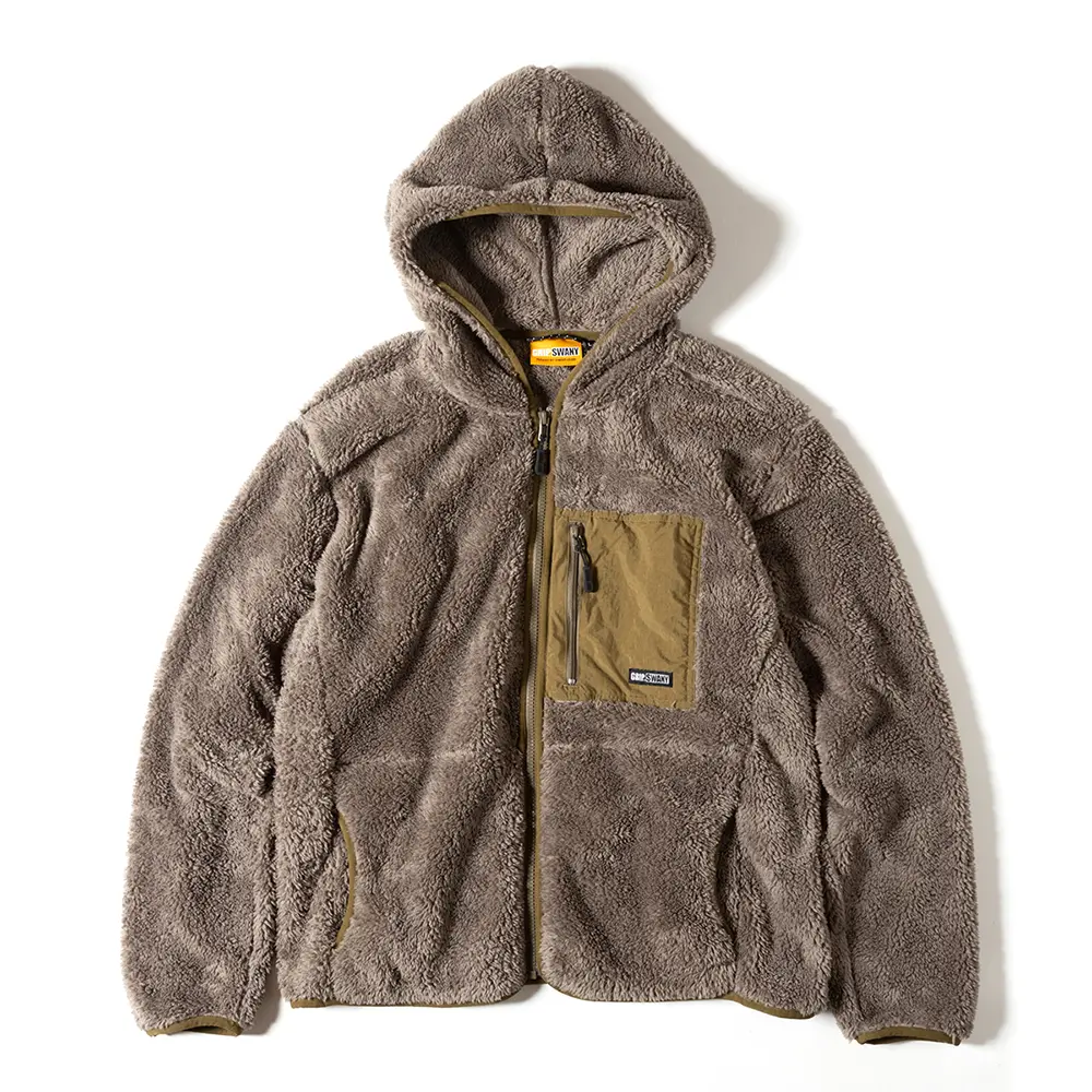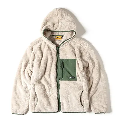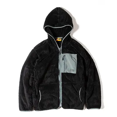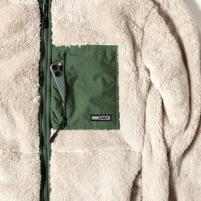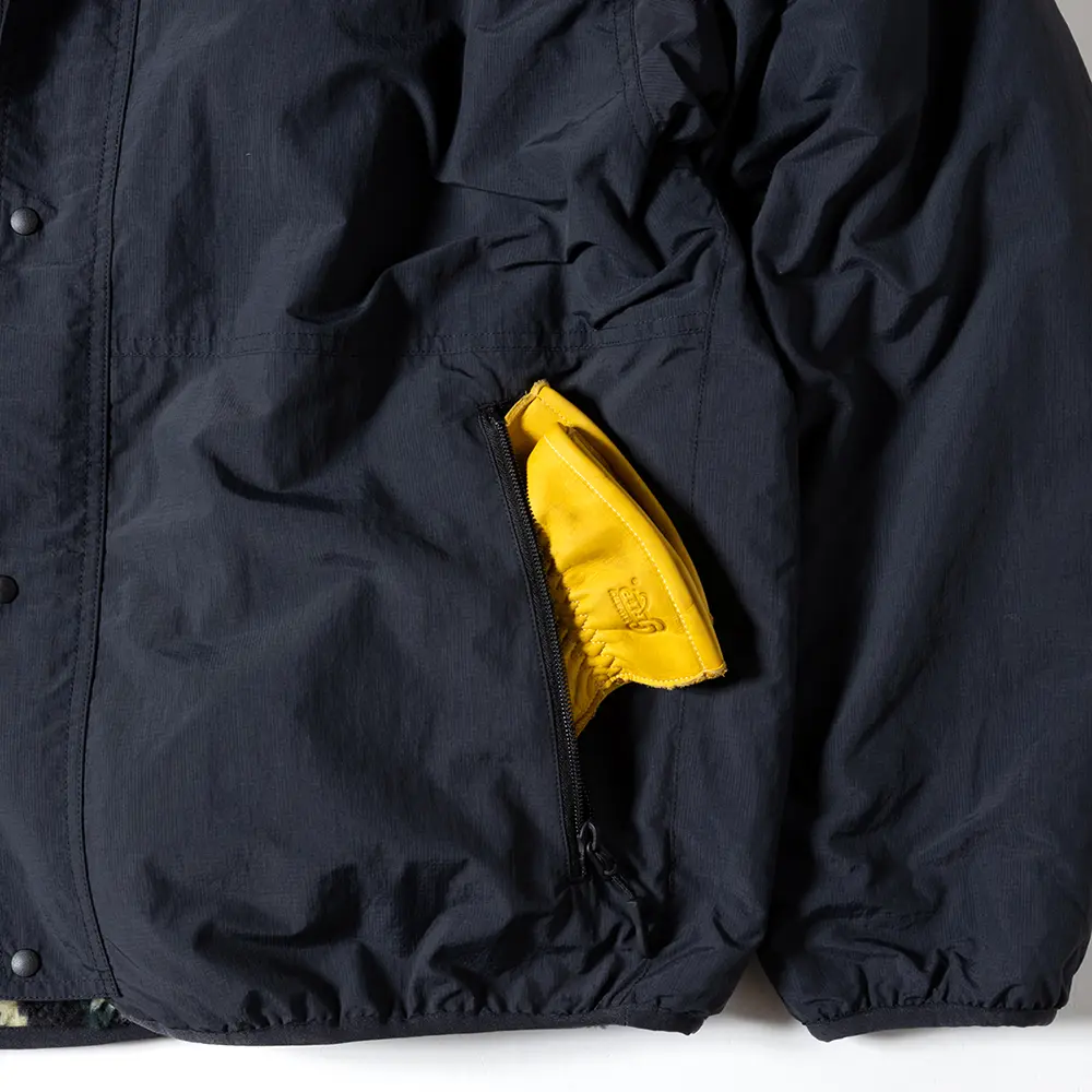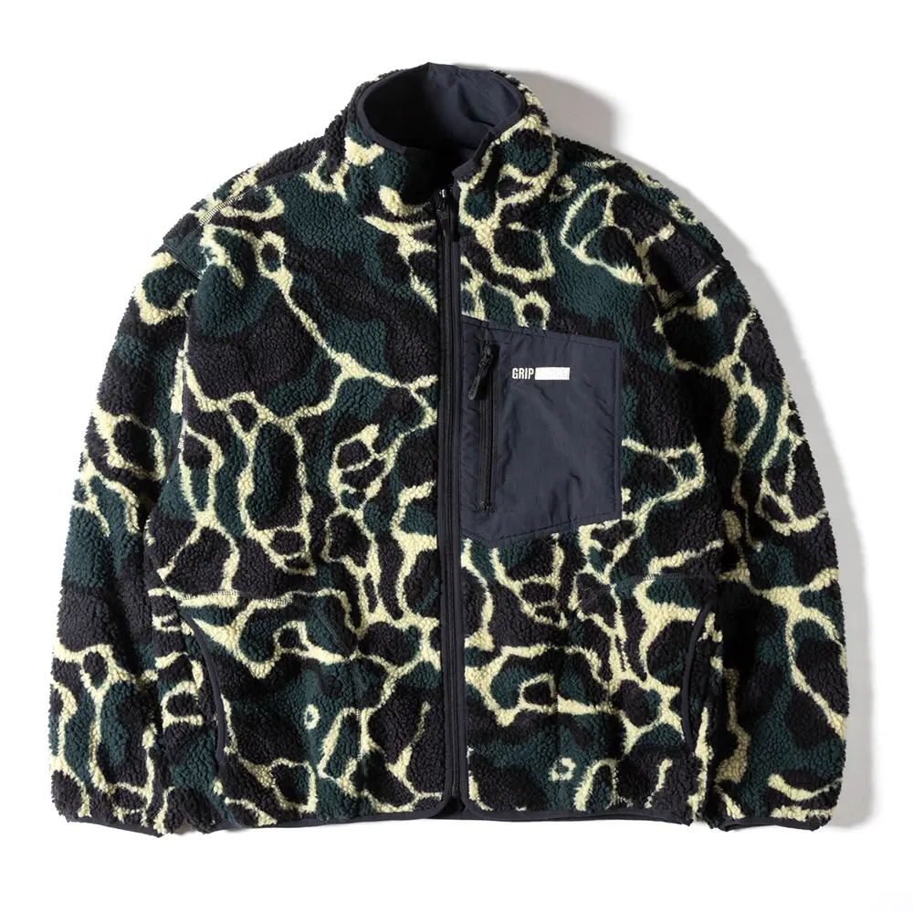 撥水ナイロンシェルにオリジナルジャングルカモフラージュ柄のボアフリースを採用した、両面着られるリバーシブルジャケット