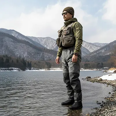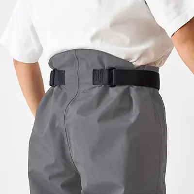 ウエストから太ももにかけてはサラサラ快適な防水透湿素材、膝より下は丈夫なナイロンにPVC加工を施した完全防水素材をハイブリッドに組み合わせた、全く新しいコンセプトのウエーダー
