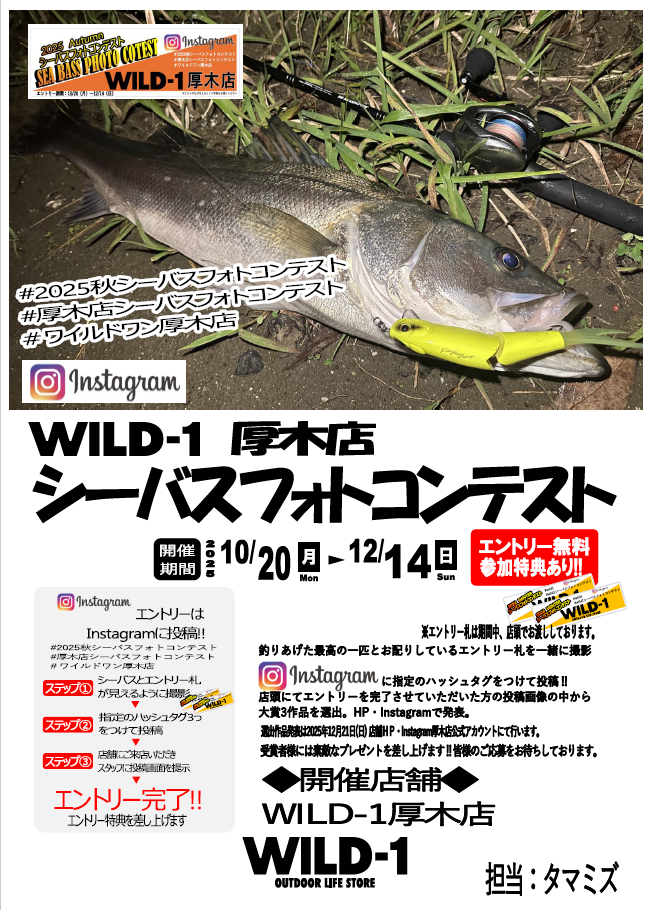 WILD-1厚木店では、10月20日(月)〜12月14日(日)の期間、シーバスフォトコンテストを開催しておりました。 エントリー頂いた皆様、誠にありがとうございました。 入賞者の発表をさせていただきます! (以下すべてInstagramアカ […]