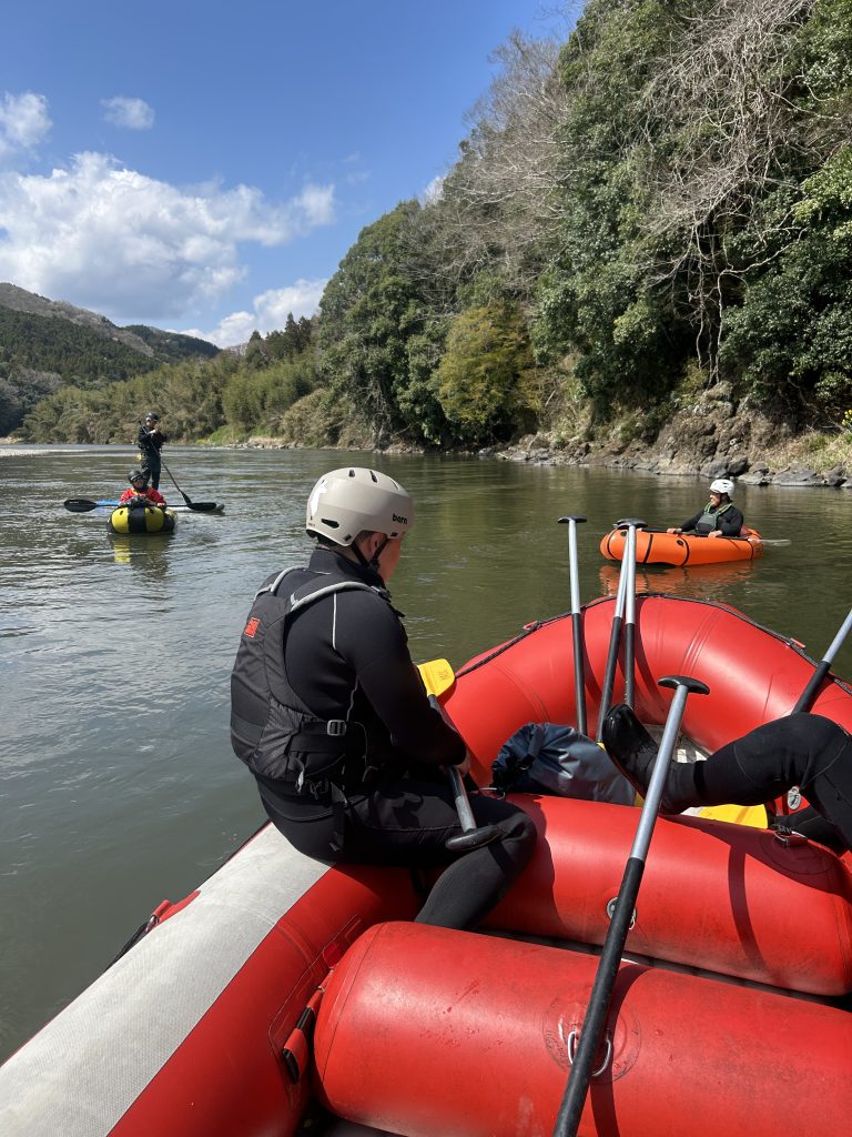 ゴムボート(ラフト)に乗り、ガイドの指示に従い参加者自身もパドルを漕ぎながら川を下るアクティビティ。