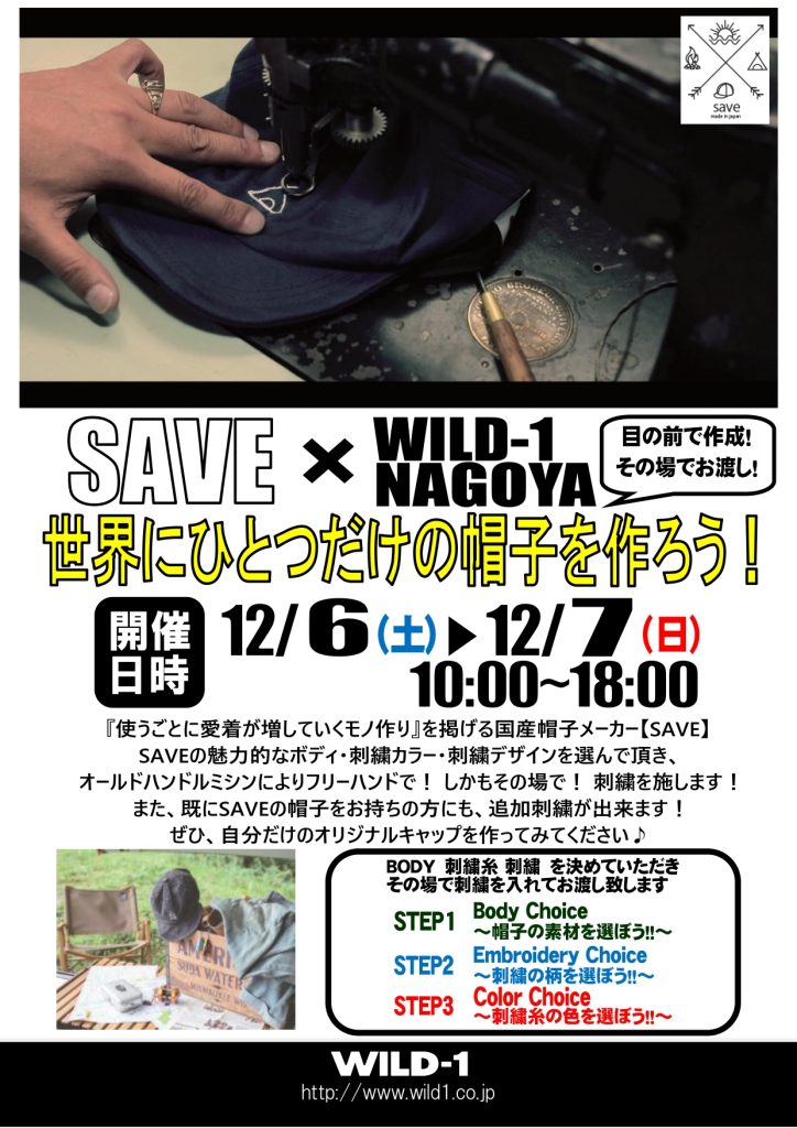 『使うごとに愛着が増していくモノ作り』を掲げる国産帽子メーカー【SAVE】SAVEの魅力的なボディ・刺繍カラー・刺繍デザインを選んでいただき、オールドハンドルミシンによりフリーハンドで!しかもその場で!刺繍を施します!