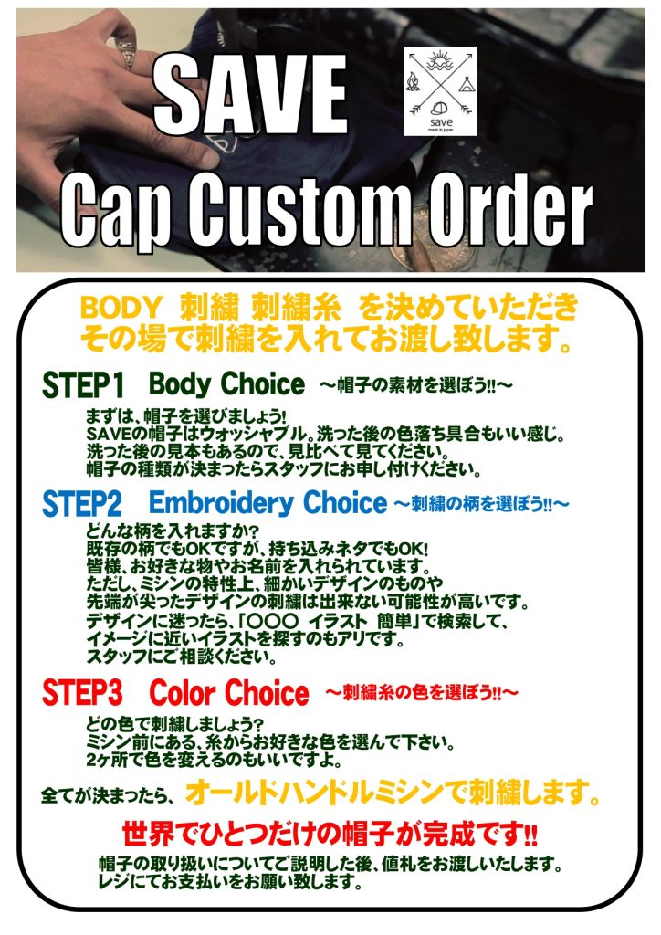 また、既に『SAVE』の帽子をお持ちの方にも、追加刺繍を施すことが可能となりました!!