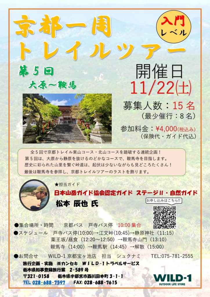 第5回は、スローハイク相応しいのどかなコースを、大原から静原に抜け、鞍馬寺を目指します。歴史街道歩きもWILD-1京都宝ヶ池店がお勧めしたいハイキングスタイルの1つ。頂上を目指す登山とは違い、山里をつなぐ峠道には見どころがたくさんあります。旅の最後は鞍馬寺。WILD-1京都宝ヶ池店の京都トレイルイベントのゴールです。山の頂上を目指す登山のすばらしさとは違う、贅沢なコースです。体力度も控えめですので、私たちと一緒に秋深まる京都を感じませんか?連続企画となっておりますが、このコースだけのご参加も可能です。お気軽にご参加ください。お申込みに際しましてご質問がございましたら、WILD-1京都宝ヶ池店までお気軽にお問い合わせください。