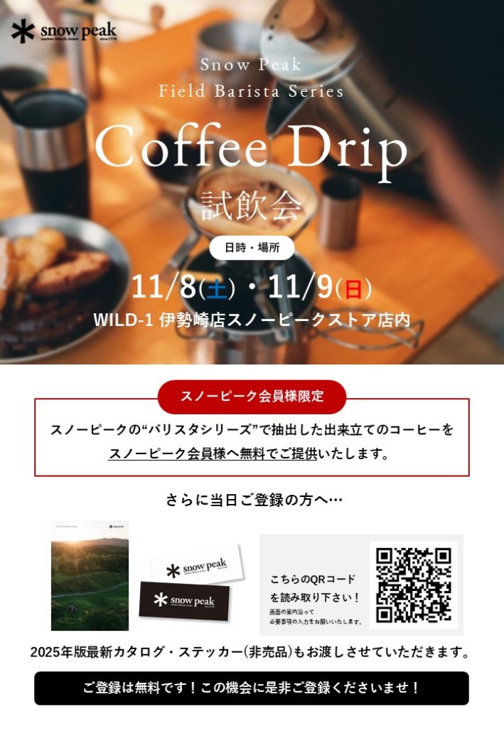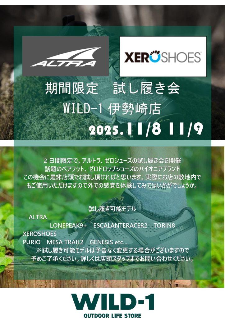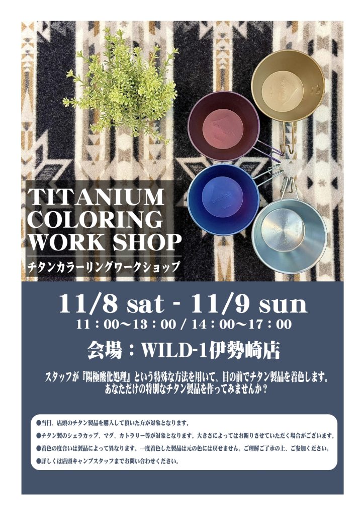 2日間。両日開催される、「チタン着色ワークショップ」「ALTRA&XEROSHOES試し履き会」「SNOWPEAKコーヒードリップ試飲会」