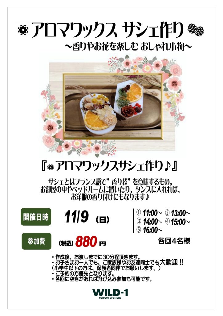 11月9日には「アロマワックス、サシェ作り」を開催いたします。