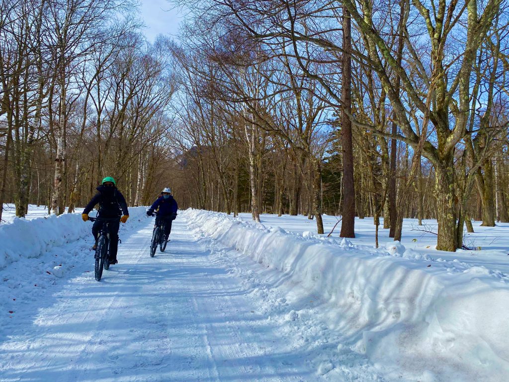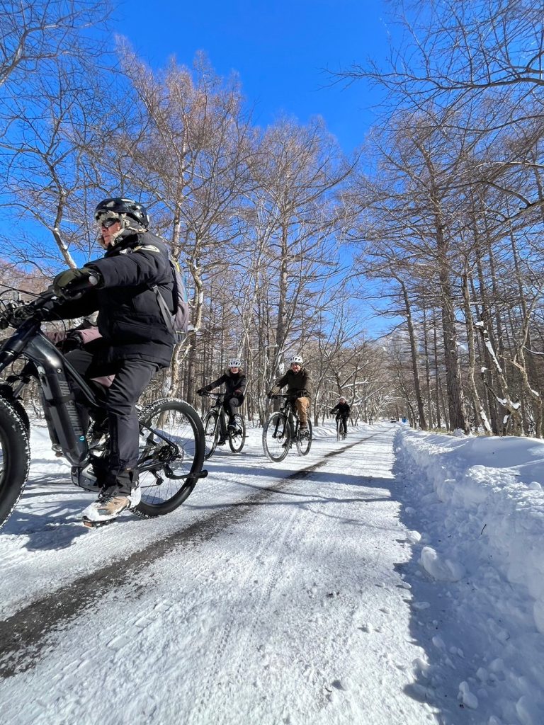 また、登山口まではeBIKE(電気自転車)に乗って、雪上サイクリングを楽しみながら向かいます。
