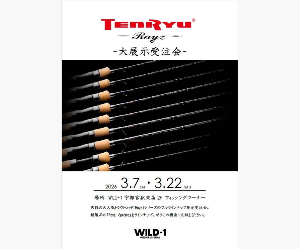 天龍 Rayz 大展示受注会 2026年03月07日(土)~2026年03月22日(日) 店頭催事・展示会 宇都宮駅東店 イベント一覧 天龍 Rayz 大展示受注会を3/7~3/22の期間で開催致します。 場所 WILD-1宇都宮駅東店2F フィッシングコーナー 天龍の大人気トラウトロッド「Rayz」シリーズのフルラインナップ展示受注会。 新製品の「Rayz Spectra」をラインナップ。ぜひこの機会にお試しください。 開催日 2026年03月07日(土)~2026年03月22日(日) 募集店舗 宇都宮駅東店 この記事を投稿した店舗WILD-1 宇都宮駅東店 近くのWILD-1店舗を探すWILD-1公式オンラインストア Tweet