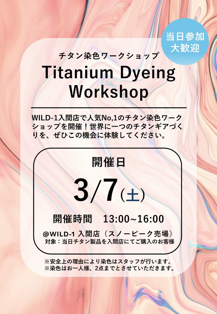3/7(土)13:00~16:00の間、WILD-1入間店ではチタン染色ワークショップを開催いたします。