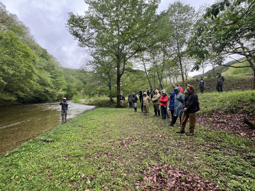 このキャンプ場の横を流れる「男鹿川」でメーカースタッフによるフライフィッシングを実演。