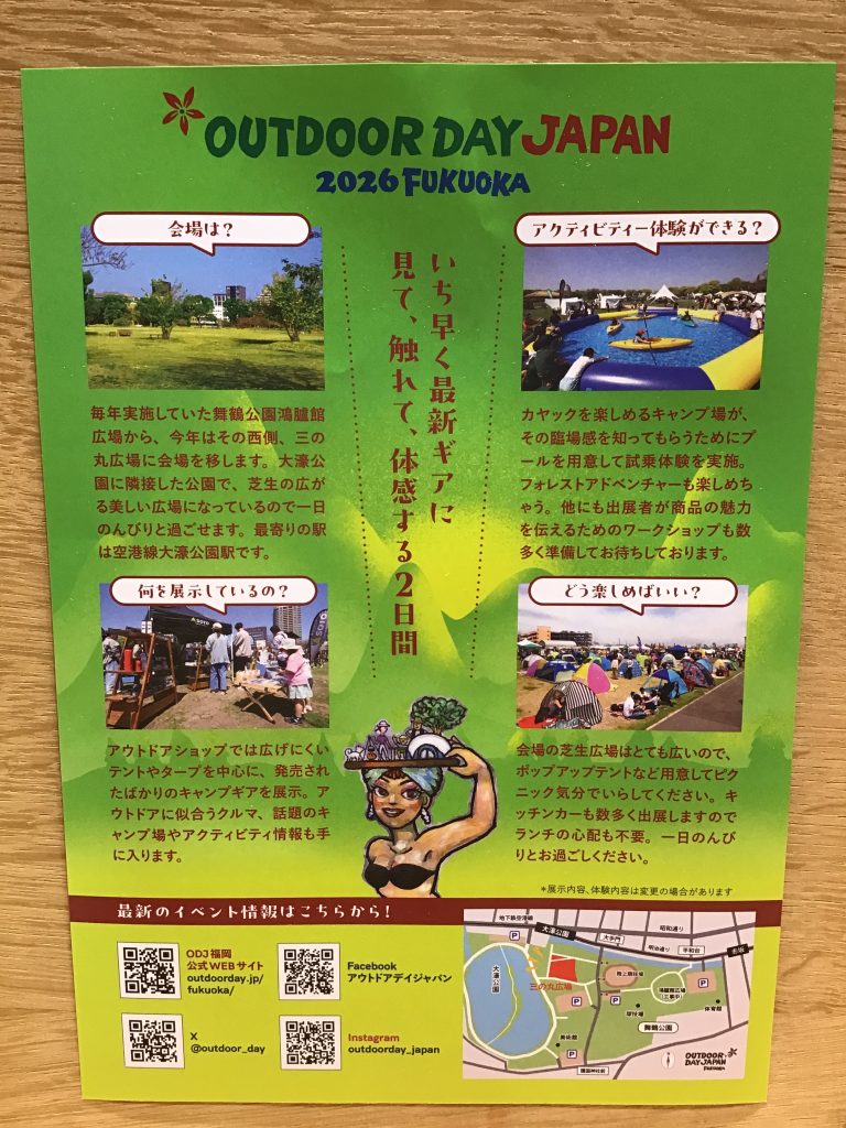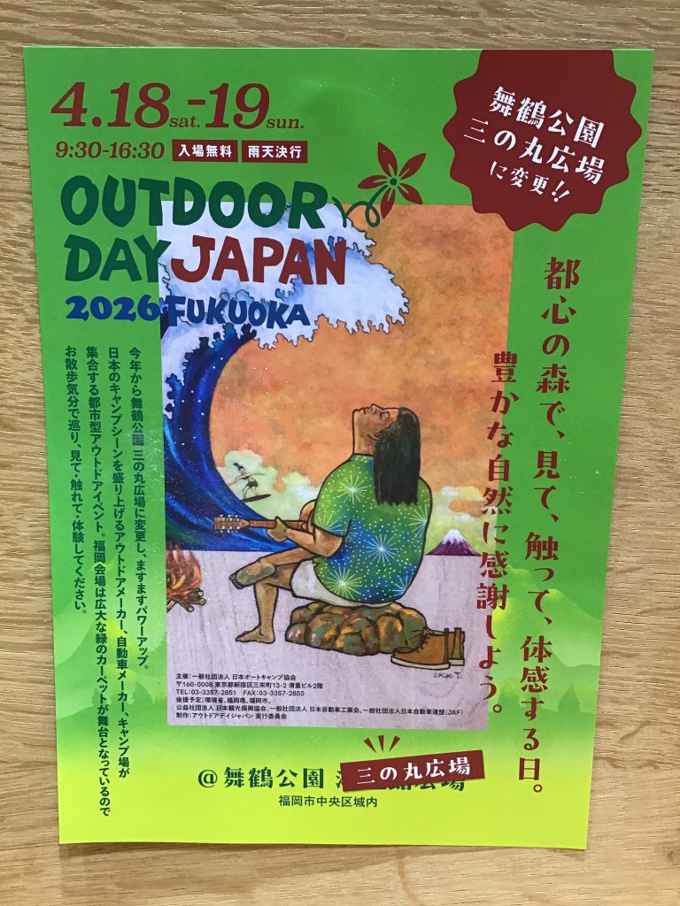 4/18(土)・4/19(日)の2日間、福岡市の舞鶴公園で開催される国内最大級の体験型アウトドアイベント「アウトドアデイジャパン福岡2026」に、当店もtent-Mark DEISIGNSと一緒にブース出展します
