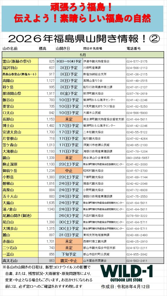 今年も、いよいよ「登山シーズン」がやってきました! 毎年恒例の「福島県山開き情報②(5月版)」が出来ました。 毎週のように各地で山開き行事が開催されますので、初めての方にはおすすめですよ! WILD-1で、登山用品の準備をして、色とりどりの […]