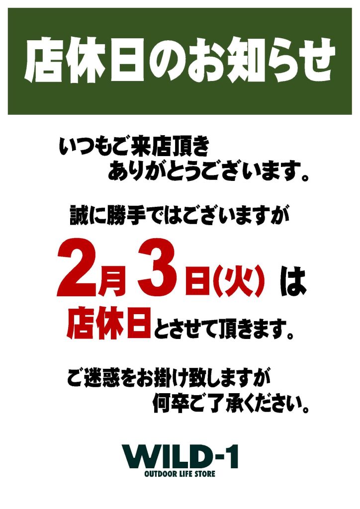 いつもWILD-1越谷レイクタウン店をご利用いただき誠にありがとうございます。 2月3日(火)は、 店休日とさせていただきます。 大変ご不便とご迷惑をおかけいたしますが、 何卒ご理解賜りますようお願い申し上げます。
