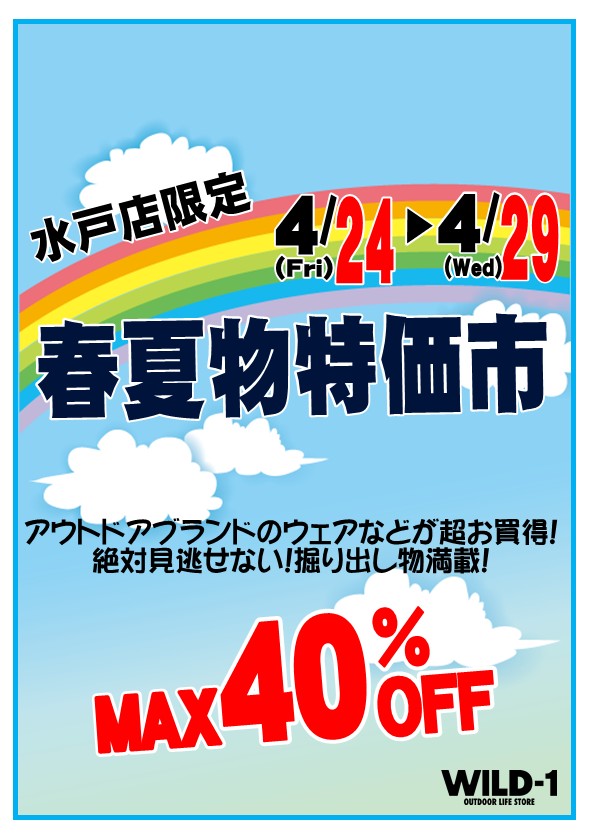 いつもWILD-1水戸店をご利用いただきありがとうございます。 4月24日〜4月29日の期間、 夏物ウェア、サンダル、シューズのアウトレットセールを開催いたします! 人気ブランドの昨年モデル、訳アリ品などアウトレット価格で販売致します! お […]