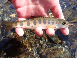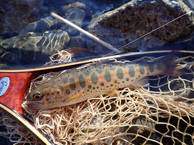 今シーズンの嬉しい一尾め、8寸イワナ。しっかりとニンフを咥えていた。カメラを構えると身をよじってにょろんと逃げて行った。
