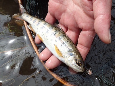 まだまだイワナの動きは鈍いらしい。懐のある程好い流れをニンフで探っていた。いくつかのアタリを取り損ねていたところ、ついに#14ヘアズイヤーニンフの誘いに乗ってきた。なんとかシーズン初のイワナと対面することができた。