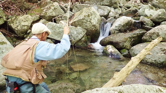 大岩の陰に身を隠しながらフライをキャストした。こちらからは着水したフライを見ることはできない。数秒が経ち、視界に入る所まで流れてくるはずのフライが、流れてこない。手元のラインを手繰り、じわりと張って、ゆっくりとアワセをくれると、右手に確かな手応えが返ってきた。