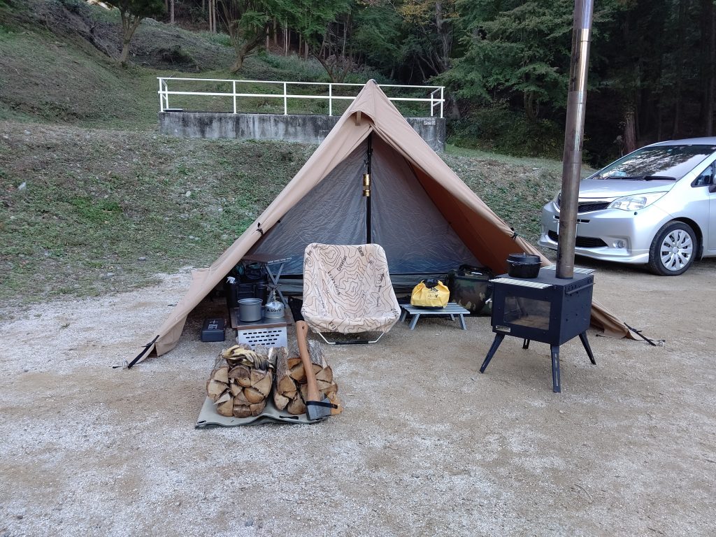 1週間前までは夏から一気に冬になったような気温差でしたが、キャンプ当日はそこまで寒くもなく、場内のイチョウやイロハモミジ、クヌギの紅葉が目に鮮やかで、図らずも秋を堪能したキャンプでした。