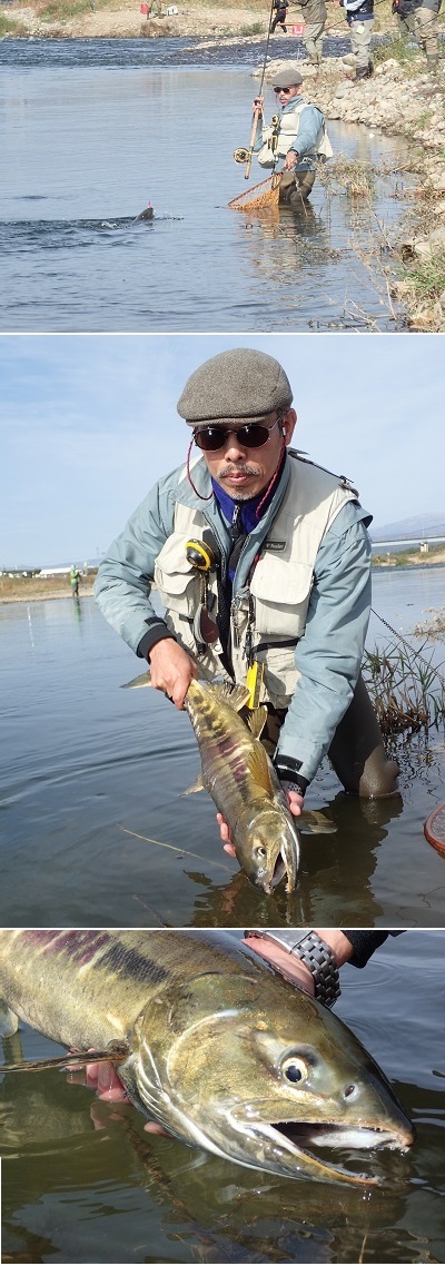 このサイズになると、ツーハンドロッドでのネットインはスリル満点になる。無事、セルフでの取り込みに成功すれば、その充実感と達成感、それはもう、ひとしおなのである。せっかく極上のスリルと喜びを味わえるのに、詰めの取り込みを人に任せるなんて、ナンセンス。不安、緊張と興奮、次いで安堵と大きな喜び!それらが一気に押し寄せる!この瞬間!これを想像して欲しい。ホントもう、勿体ない!お化けが出るぞ!ああ、また幸福ホルモンに酔いたい…。