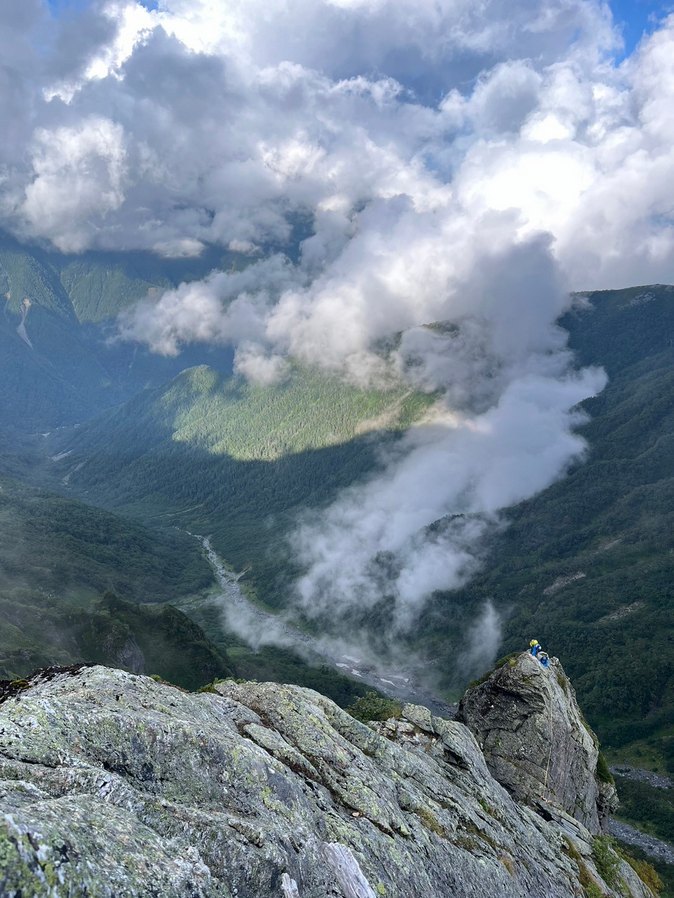 普段登る登山道とは全く違う景色に感動しつつも、切り立った崖を登る高度感に対する恐怖心とが入り交じりました。。。