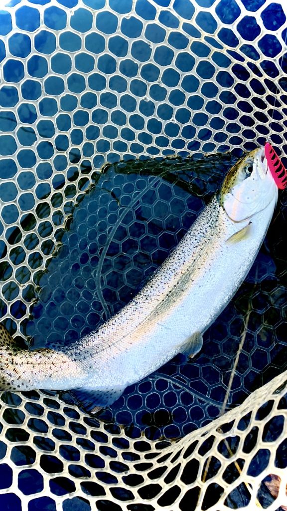 最低気温マイナス4℃でのスタート ルアーは重ためのスプーンでボトムのずる引き(スロー)で好反応 数投でまずは元気の良い一尾をキャッチ