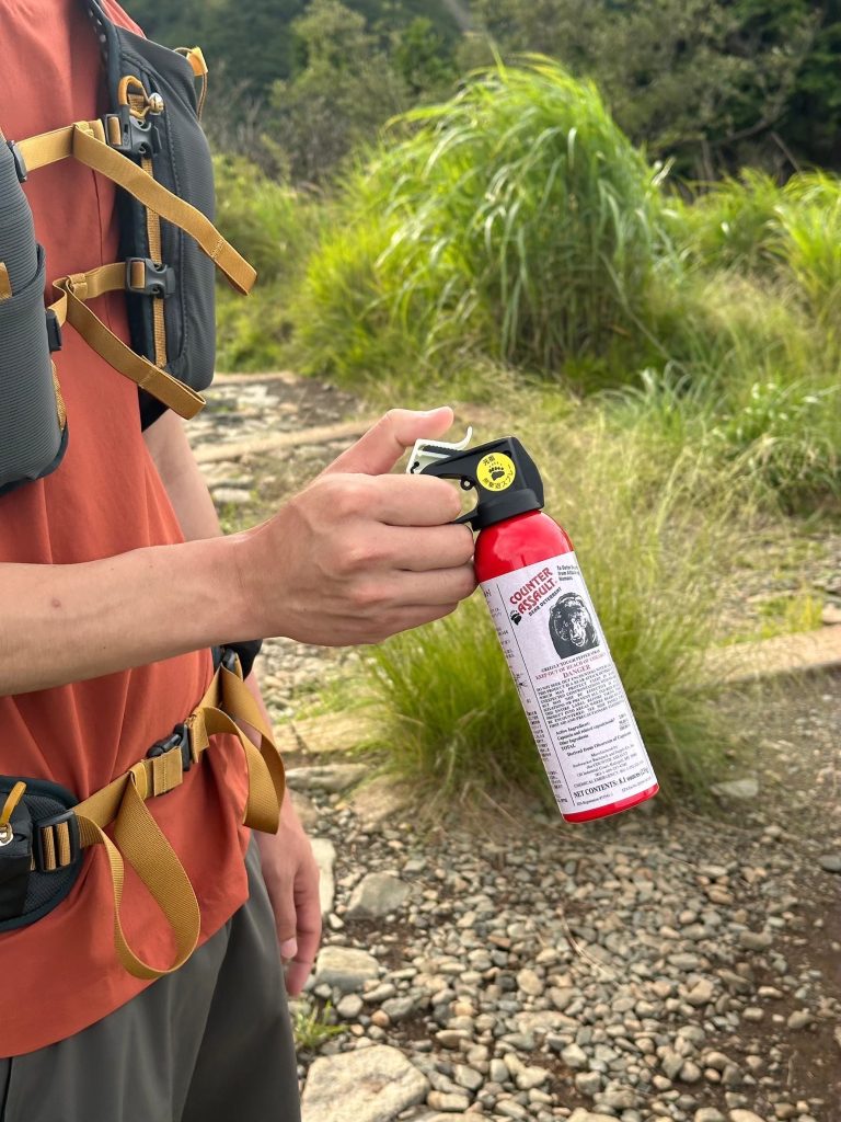 唐辛子の刺激成分を噴射して、その刺激成分で熊を撃退するアイテムです。