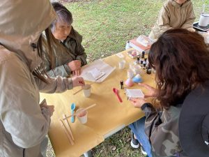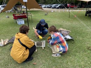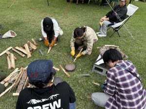 ナイフを使ってフェザースティック作り。ファイヤースターターで火付け体験