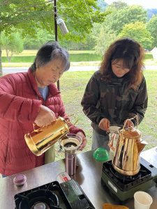 スタッフが生豆を焙煎した珈琲豆をミルで挽いていただき優雅なコーヒータイムを楽しんでいただきました。