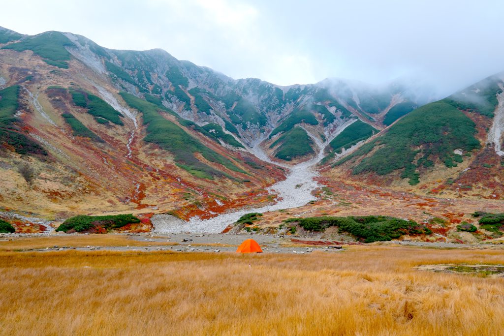 一面の紅葉をバックにオレンジ色のテントがよく映えます。