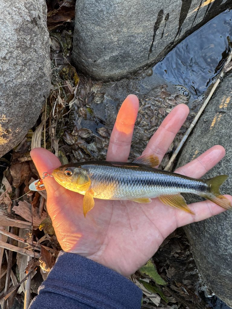 その後も岸辺を狙うとカワムツ、流れの中を狙うとオイカワが釣れて、生体の違いもハッキリ分かる楽しい釣行でした。