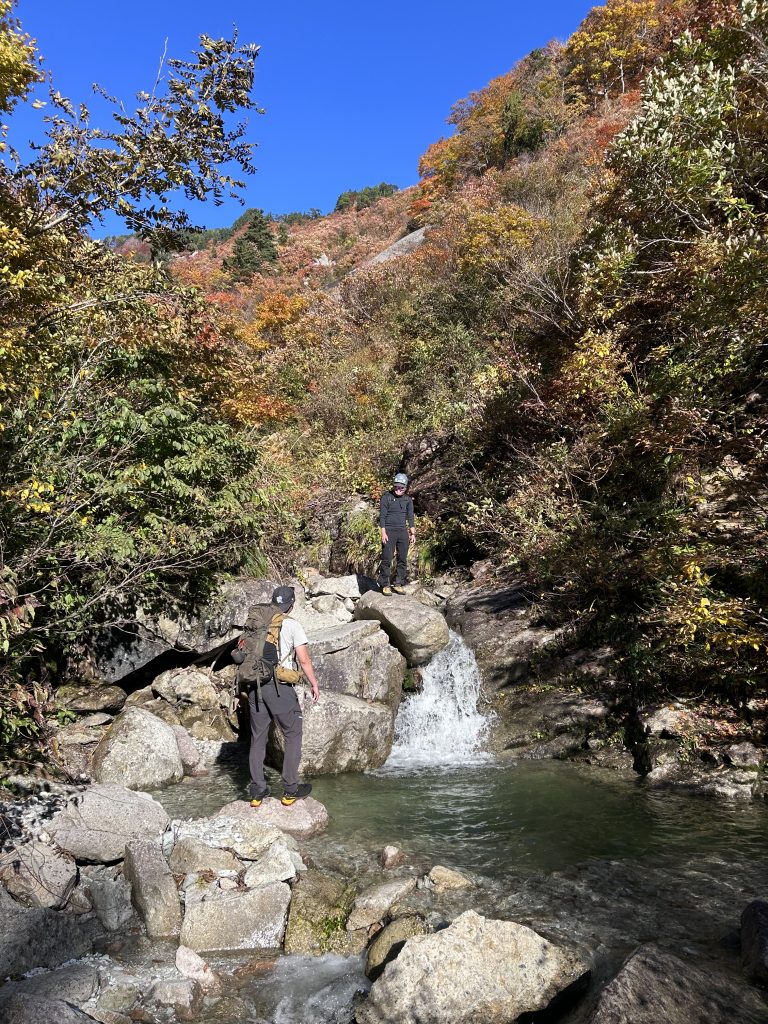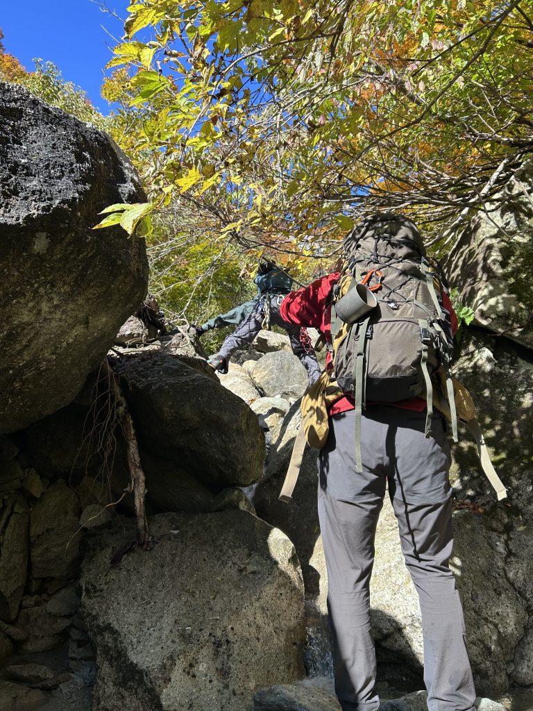 1時間ほど沢を進むと大きな岩があり、そこから先は沢を登れないので山の斜面を登っていきます