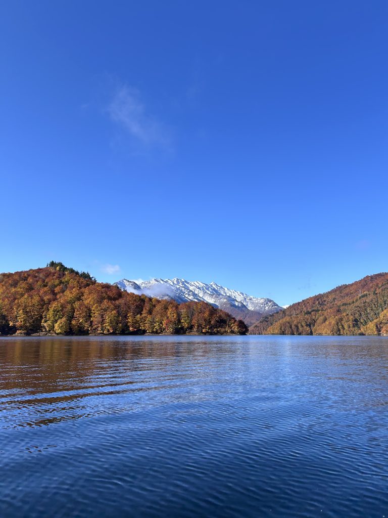 この日は前日に若干雪が降ったようで、色づいた山々の上の方にうっすら雪をまとっていました
