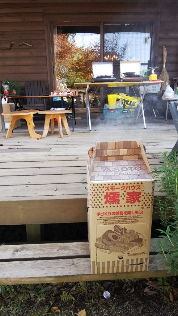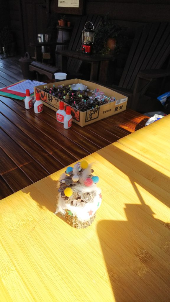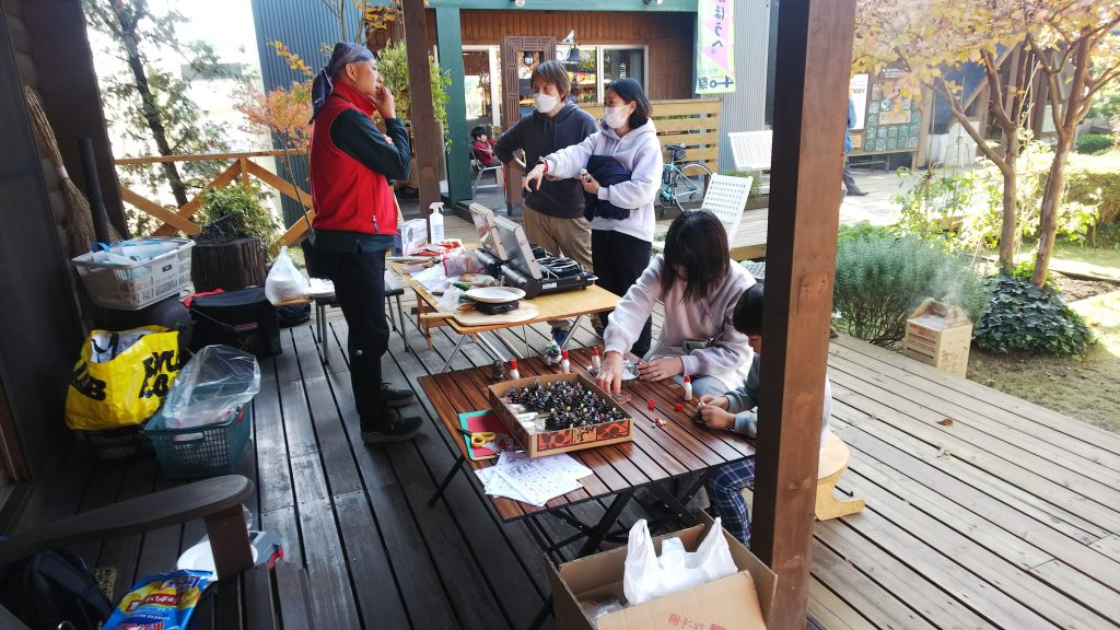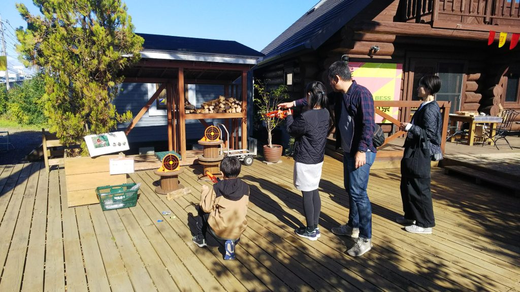 WILD-1ブースでは、ワークショツプ(松ぼっくりアート)、試食会(燻製、ホットサンド、スモア)、外遊び(モルック、クロスボウ射的、フィールドビンゴ)、テント展示、フォールディングカヤック展示を行いました。
