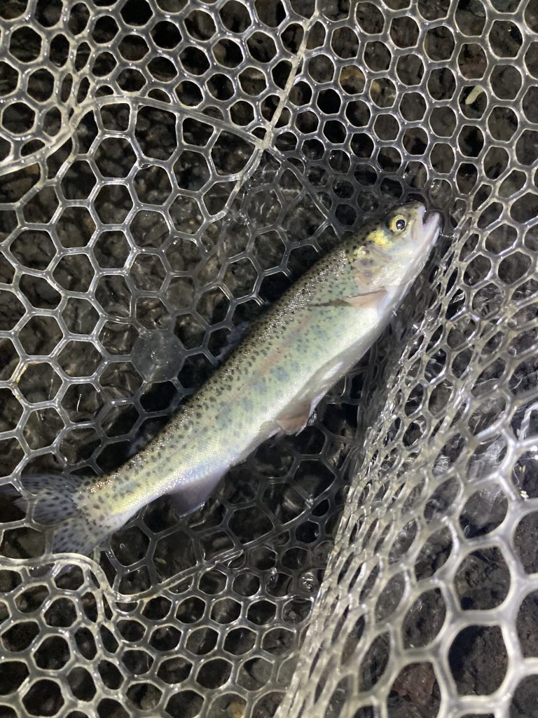 そのままいつもの要領でマラブーストリーマーを引っ張っているともぞもぞっというアタリがあり、ちいさいながらも綺麗なレインボートラウトが釣れてくれました。