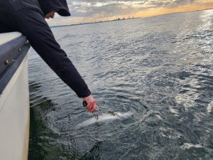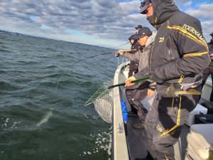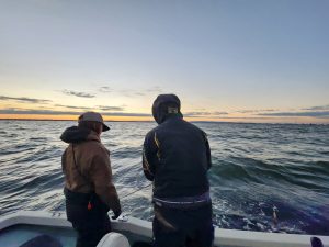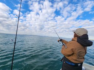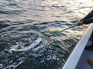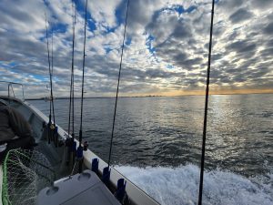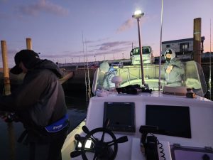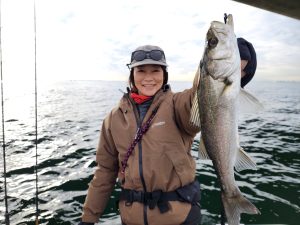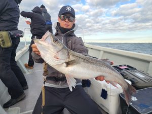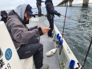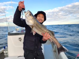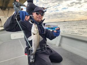 当日朝は少し風が強く、波もある状況でしたが、開始すぐにミヨシで投げていたお客様にシーバスがヒット!が船っぺりでかけてしまったためいきなり真下に潜らて痛恨のラインブレイク、、なかなかの引きだっただけに残念、、