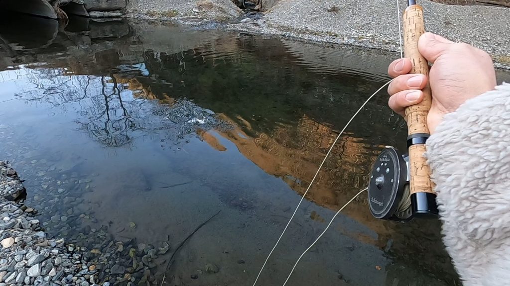 渓流解禁前にマイクロドラッグ回避の効果を狙った細いティペットに慣れておきたかったのでの、ティペットはLDLフロロの9xを使用しました。