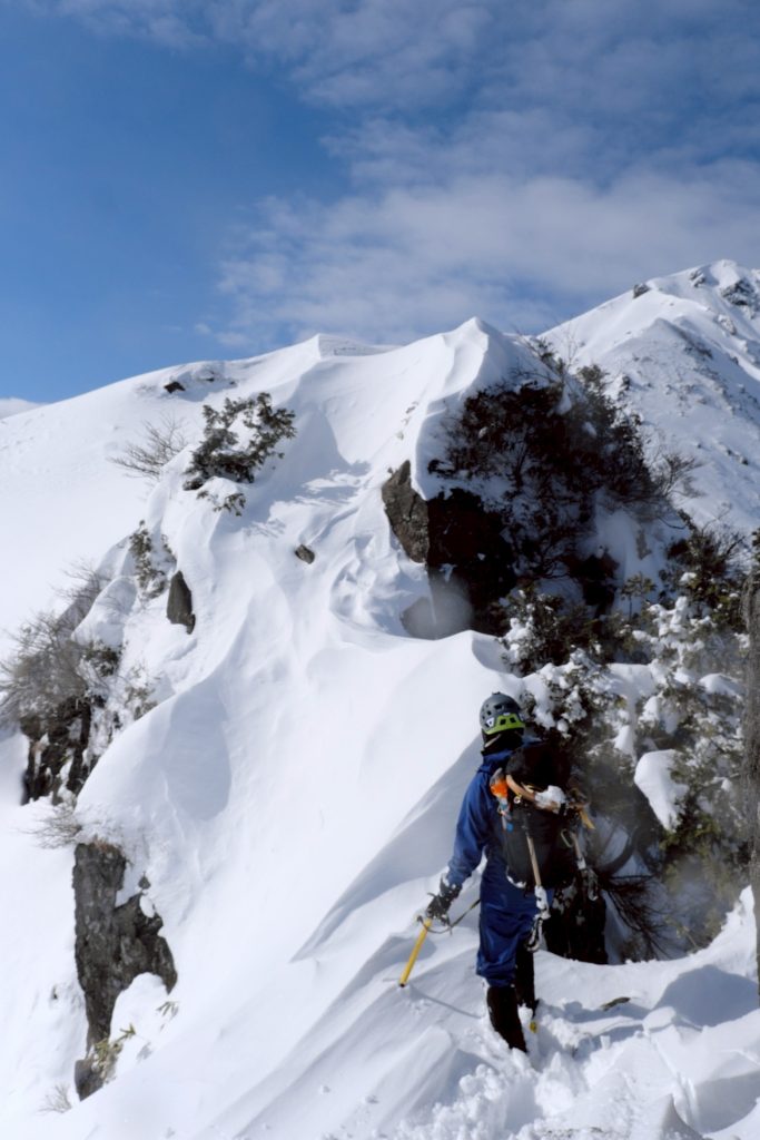 一緒になった登山者の方々とラッセルを交代しながら樹林帯、ナイフリッジを抜けて安全なところで休憩。