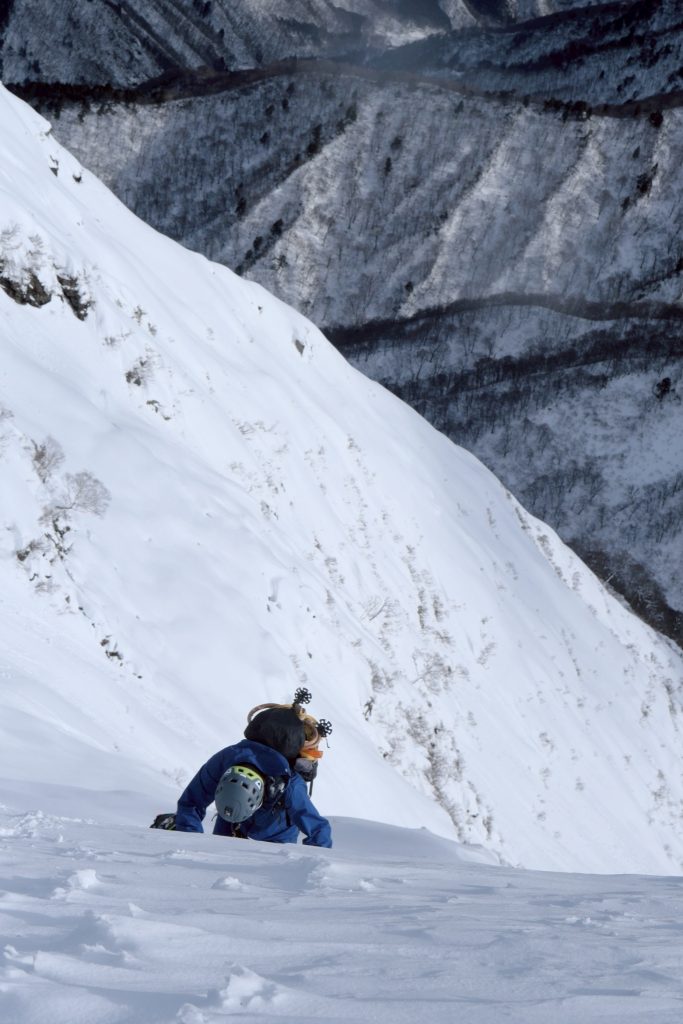 西黒尾根の後半はひりつくような急な斜面がつづき、アイゼンとピッケルのグリップをしっかり確認しながら一歩一歩登っていきました。