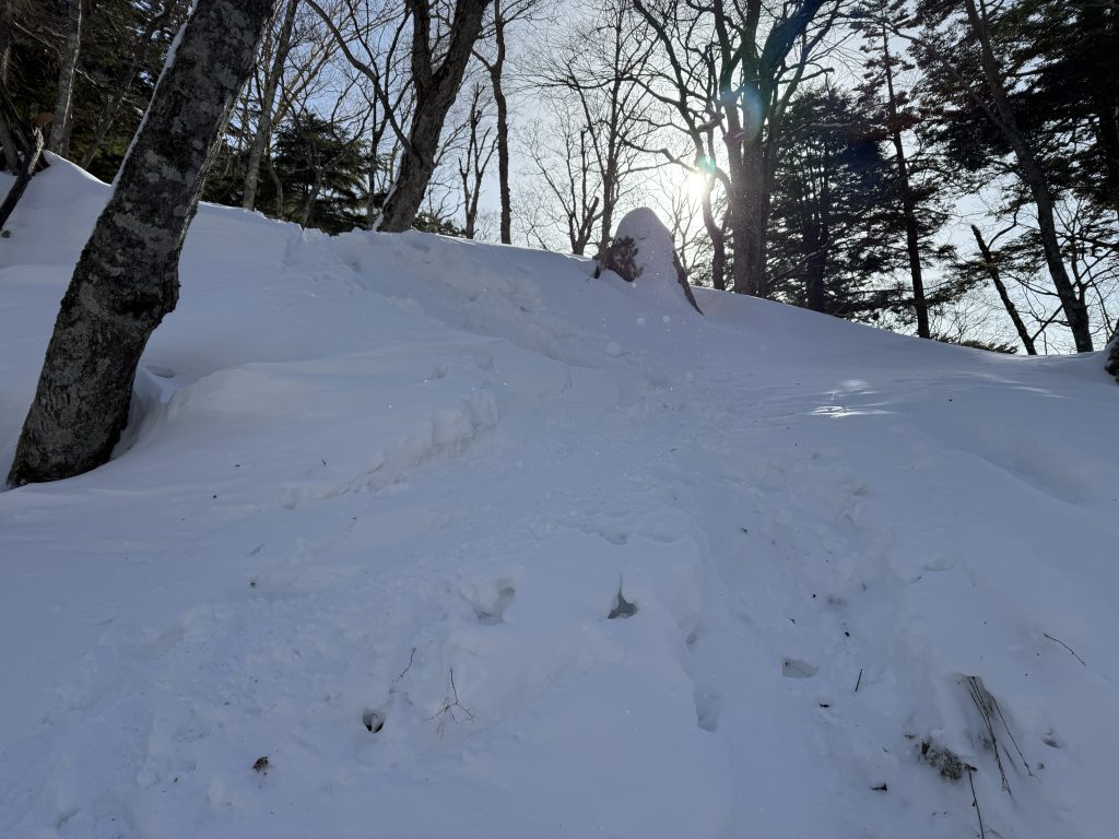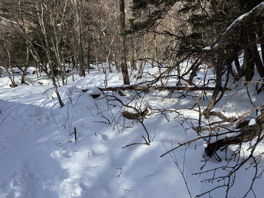 ただ、トレースも違うルートに分岐していたりと完全に信じ切らずに行った方が良いです。たまにスノーシューで行ったのかなという後も何度か見かけます。