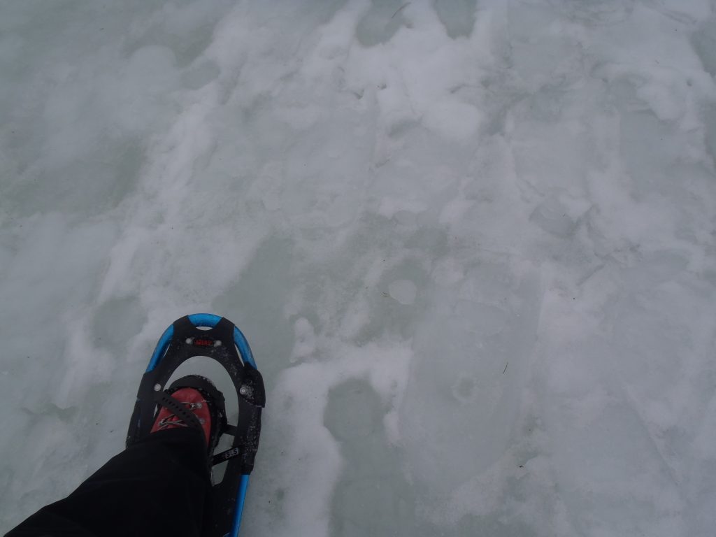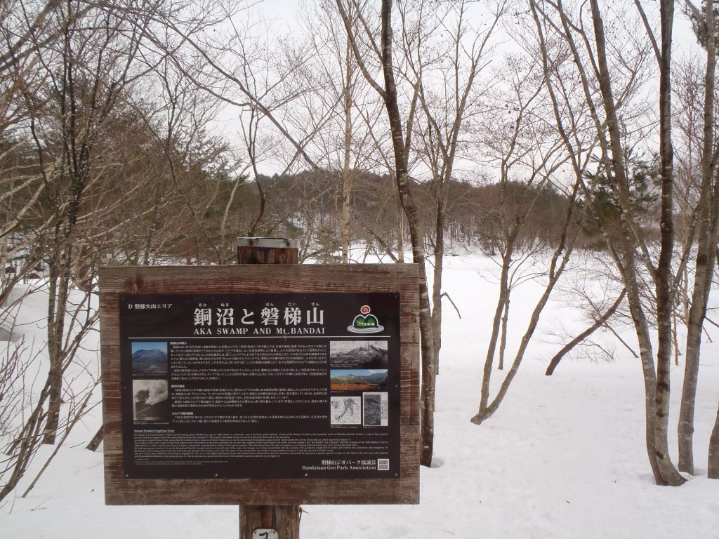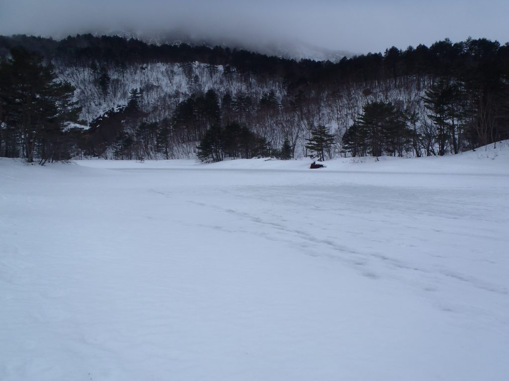 リフトを2本乗り継ぎ、スタート地点に到着しても、「雪の少なさ!」が目立ち、いつもなら案内の看板が雪で埋まるくらいなのに、普通に看板が見られる状態に。コース中、ブッシュも多く、低木や岩が出てきているので歩きにくい感じです。また、凍結している銅沼の氷上歩きも醍醐味の一つですが、氷が薄くなってきている場所もあり、氷上歩きをする際は細心の注意が必要です。