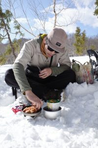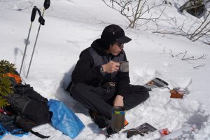 保温ボトルやフードコジーがあると暖かいものをすぐ食べられ、長く暖かさをキープしてくれるのでオススメ。THERMOS、montbellといった保温ボトルはWILD-1各店で販売しております。休憩後は来た道を戻り、ツェルト講習会の候補地を探しながら玉原スキー場へと戻ってきました。