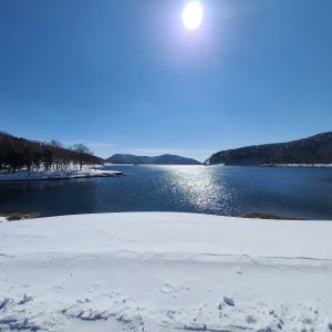 1時間ほどで玉原ダム湖を眺める絶景ポイントに到着。少し休憩を取り、玉原湿原を目指しました。玉原湿原も白銀の世界が広がり、ゆっくりと景色を楽しむことができました。