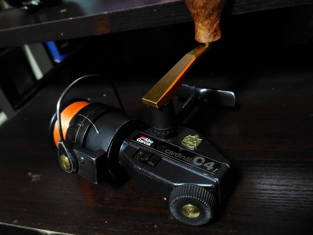 もちろん、現代のリールのハンドルノブをウッドに交換!もカスタムです。