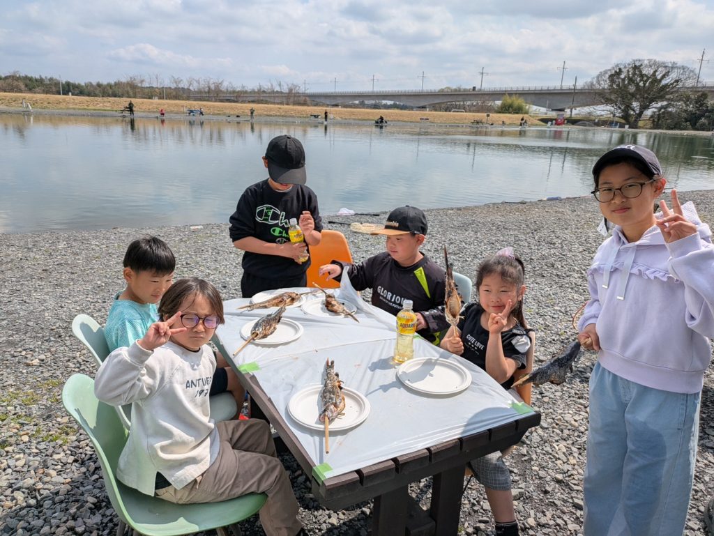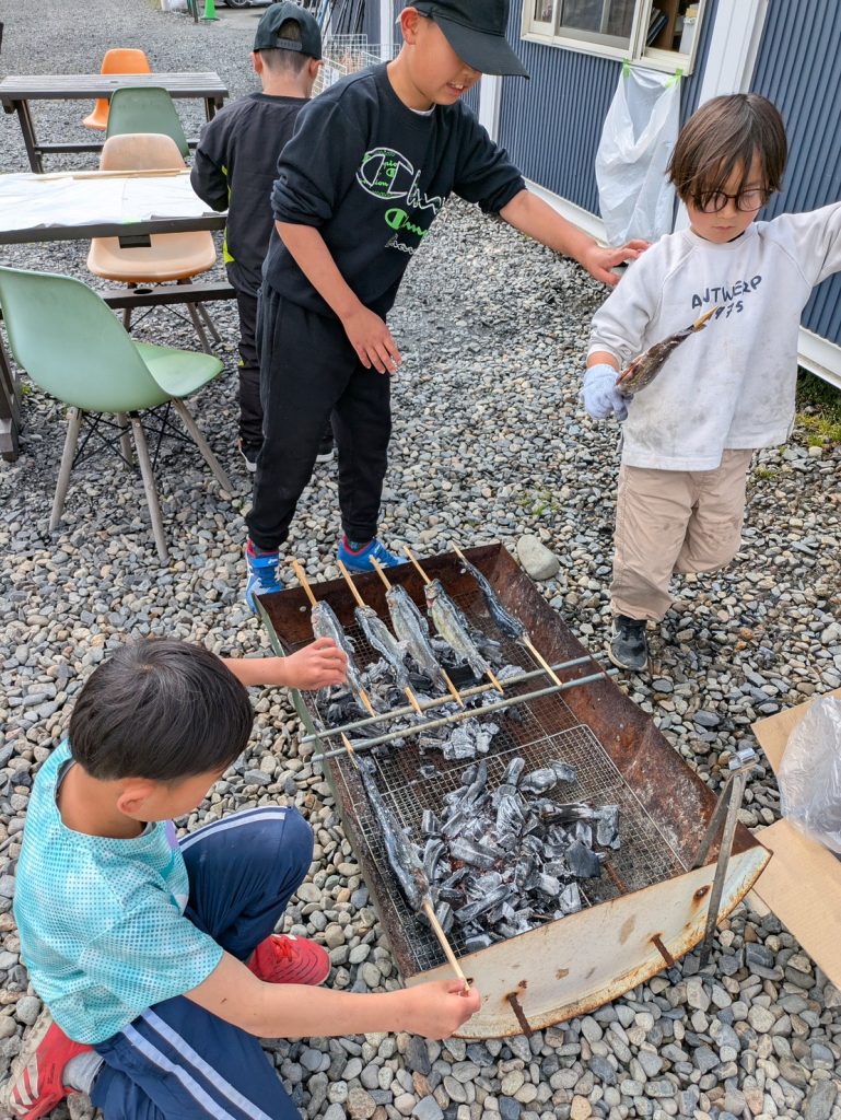 最後はみなさんでニジマスの塩焼き体験も行い、