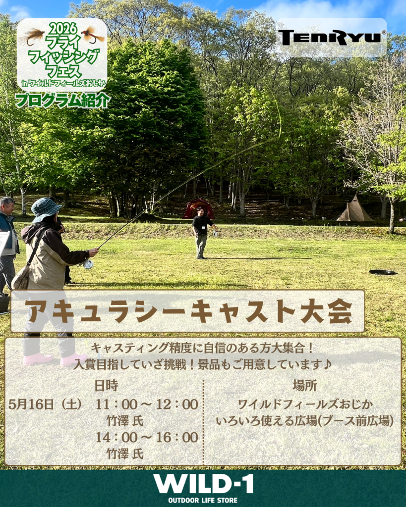5/16、17日ワイルドフィールズおじかで開催される“2026フライフィッシングフェス”ではいろいろなプログラムをご用意して皆様のご来場をお待ちしております。 プログラムのひとつにアキュラシーを競うフライキャスティング大会をご用意しました。 […]