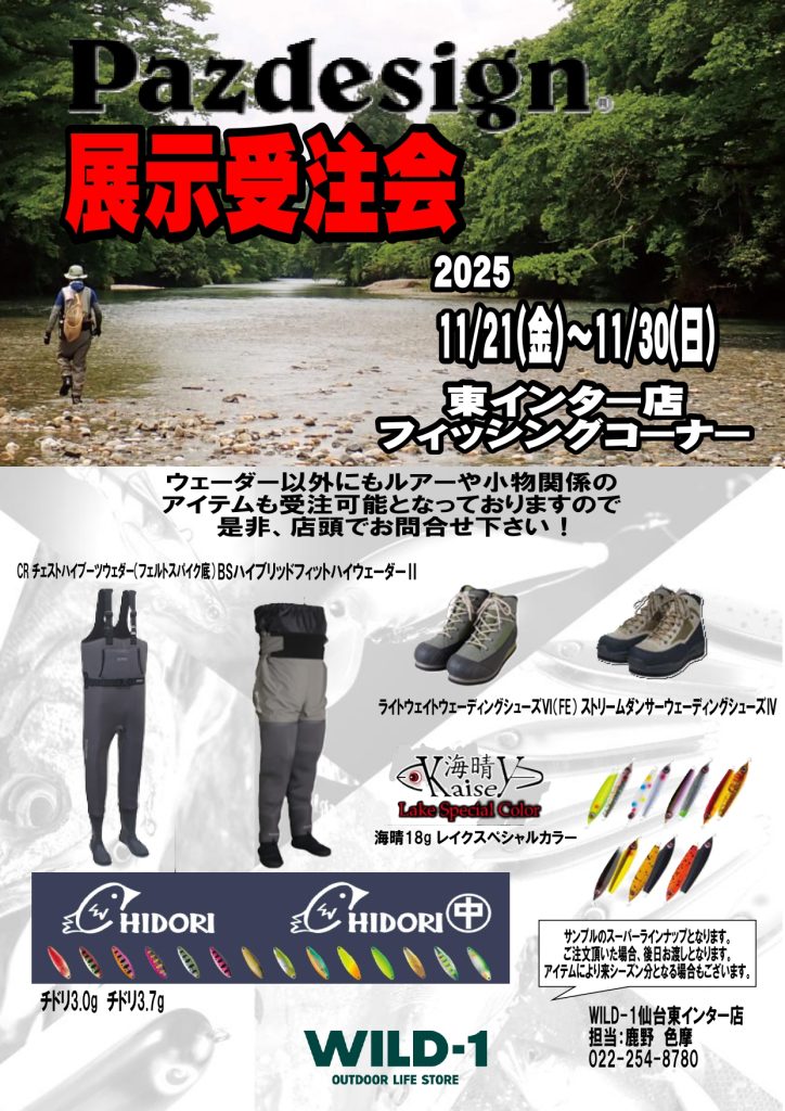 Pazdesign展示受注会 場 所:WILD-1仙台東インター店2Fフィッシングコーナーにて 開催日:11月21日(金)~11月30日(日) ソルトからフレッシュウォータールアーまで、幅広いラインナップと 機能性機動力にデザインを重視して […]