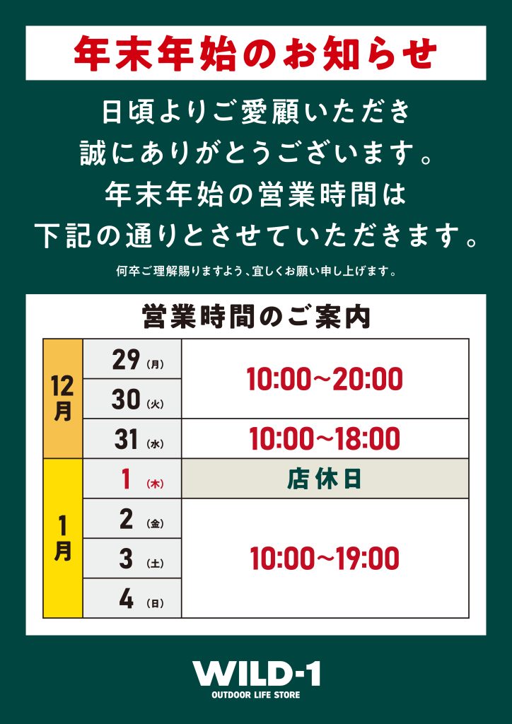 平素よりWILD-1仙台東インター店をご愛顧いただき、誠にありがとうございます。 WILD-1仙台東インター店 年末年始の営業時間をご案内いたします。 引き続き、WILD-1 仙台東インター店をご愛顧のほど、よろしくお願い申し上げます。 # […]