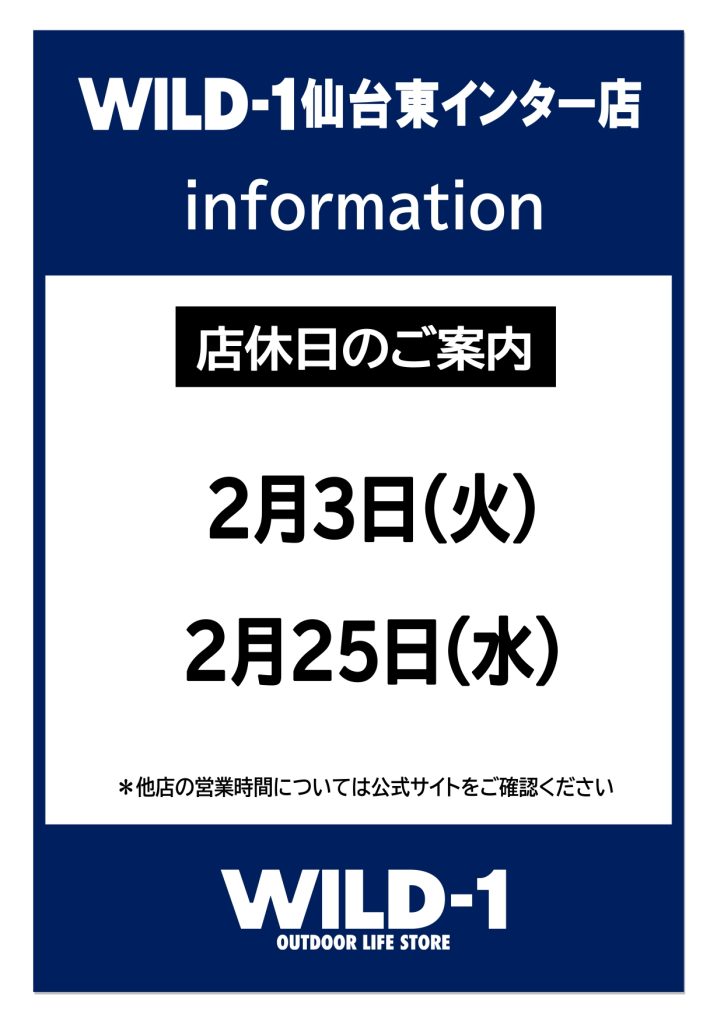 平素よりWILD-1 仙台東インター店をご愛顧いただき、誠にありがとうございます。 誠に勝手ながら、下記の日程を店休日とさせていただきます。 2月3日(火)・2月25日(水) お客様にはご不便、ご迷惑をおかけいたしますが、何卒ご理解賜ります […]