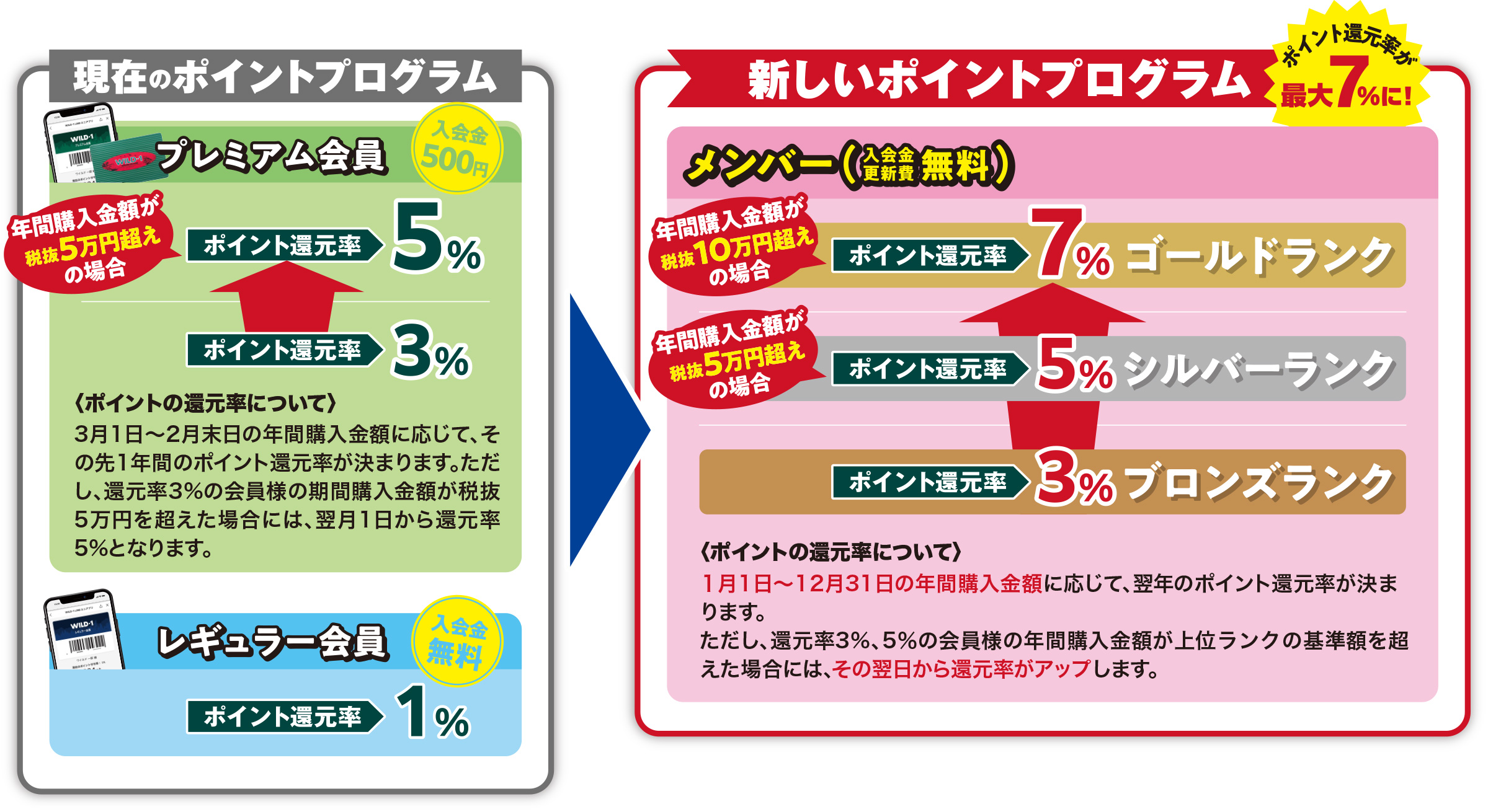 下記の期間中における、WILD-1店舗およびオンラインストアでの購入金額によって、翌年の会員ランク(ポイント還元率)が決まります。